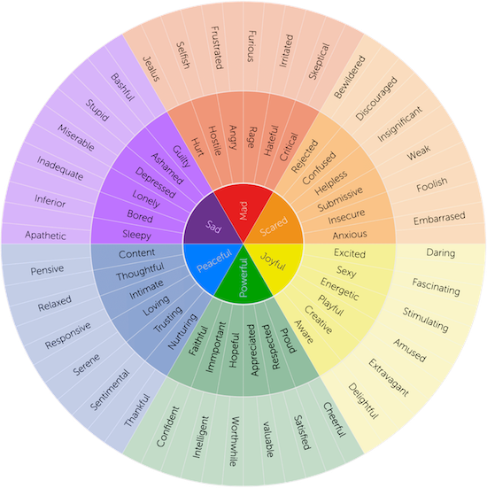Identify feelings you notice in yourself and in others. Expand your emotional vocabulary by studying the definitions of different emotions. The feelings wheel below is a great resource.